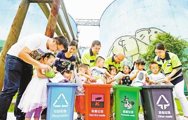 黑石子餐廚垃圾處理廠,小朋友們?cè)诠ぷ魅藛T指導(dǎo)下玩“為垃圾找個(gè)家”垃圾分類游戲。