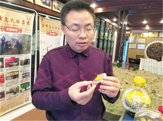 云陽(yáng)渝峰烏天麻展廳,張成生向顧客介紹烏天麻的功效。