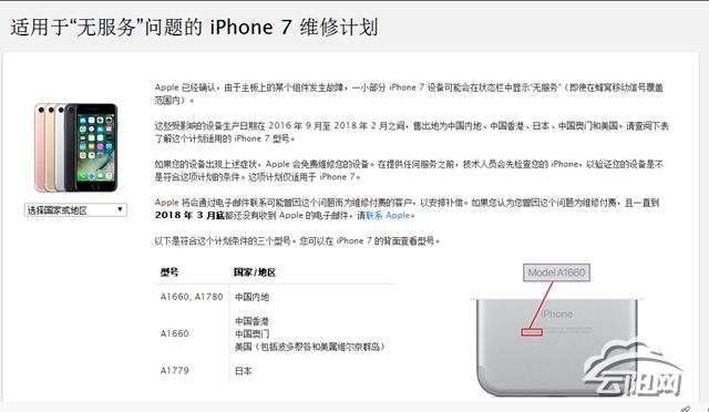云陽網訊(實習生 彭博)針對部分iPhone7經常在有網絡覆蓋的情況下依然無法聯網的問題,近日,蘋果在其公司官網發布了適用于“無服務”問題的 iPhone 7 維修計劃。