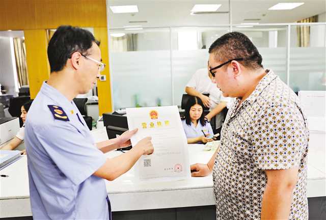 大足區(qū)行政辦公中心,大足區(qū)工商局為一企業(yè)主辦理“三十一證合一”營業(yè)執(zhí)照(攝于7月3日)。通訊員 黃舒 攝