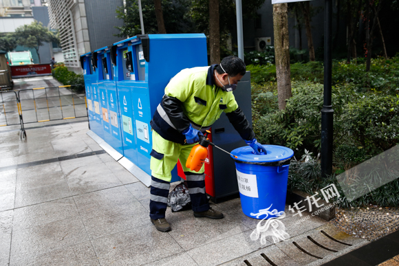 渝北區(qū)春風城市心筑小區(qū),清潔工正在對口罩專用垃圾桶進行消毒。華龍網(wǎng)-新重慶客戶端記者 石濤 攝