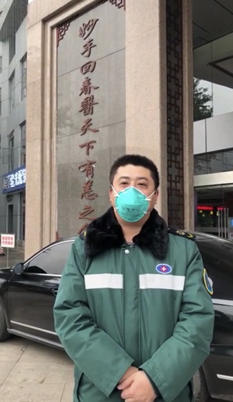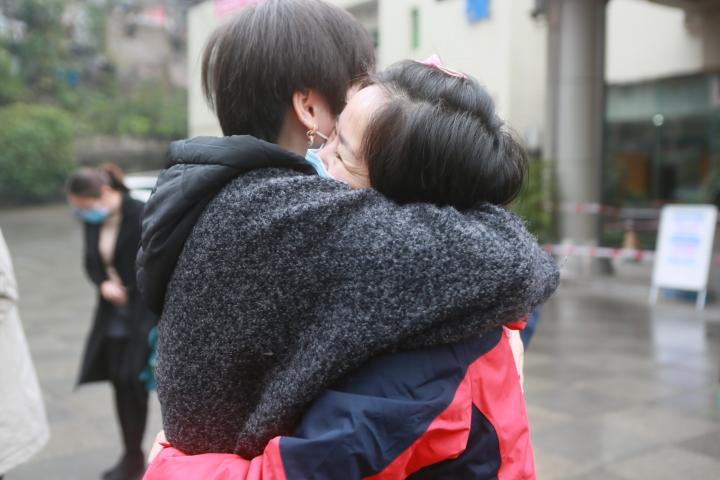 綦江區(qū)人民醫(yī)院前的廣場上,即將出征的兒科護士文道會與朋友相擁道別。受訪醫(yī)院供圖 華龍網發(fā)