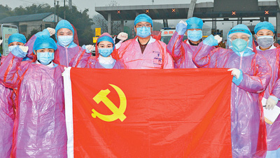 2月5日,在湖南益陽(yáng)市高速公路鄧石橋出口,參與對(duì)乘車人進(jìn)行體溫監(jiān)測(cè)的康雅醫(yī)院黨員重溫入黨誓詞。為發(fā)揮黨員的模范帶頭作用,益陽(yáng)各交通要道路口、車站卡口工作人員成立了臨時(shí)黨支部,設(shè)立了黨員示范崗。