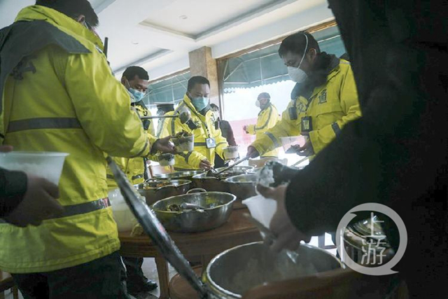 因為服務區餐廳關閉,隊員只好吃方便面、自熱米飯。在惡劣的天氣面前,執法隊員沒有一個人退縮,仍然堅持在一線。