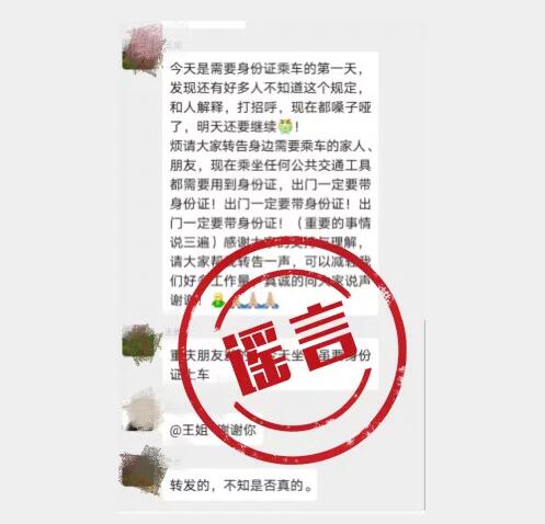 今日,有網(wǎng)傳消息稱:今日起,在重慶乘坐任何公共交通工具,均需攜帶身份證。該消息引起網(wǎng)友的廣泛關(guān)注與傳播。經(jīng)核實(shí),此消息系謠言。按規(guī)定,乘坐飛機(jī)、火車、輪船和長途汽車必須持本人身份證,但是在城區(qū)內(nèi)乘坐軌道交通和公共汽車不需要身份證。同時,在此提醒市民:從2020年2月8日起,對主城區(qū)老年人公交免費(fèi)卡暫停使用(持身份證也無效),直到我市突發(fā)重大公共衛(wèi)生事件一級響應(yīng)結(jié)束時恢復(fù)。