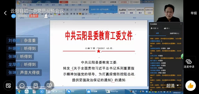 云陽網訊(通訊員 張慶華)2月12日,初一中黨支部召開疫情防控工作推進會。全體黨員收看了釘釘直播會議。