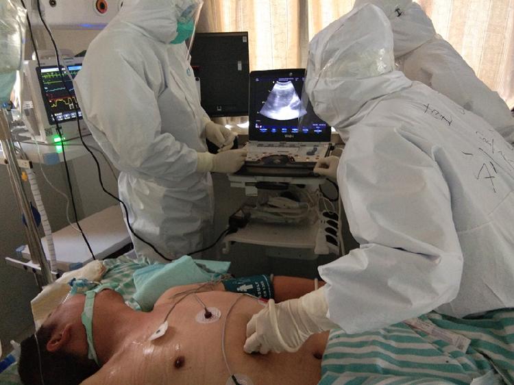 ▲劉景侖(右一)和助手在調節呼吸機參數和用超聲檢查患者,進行ECMO術前準備。 受訪者供圖