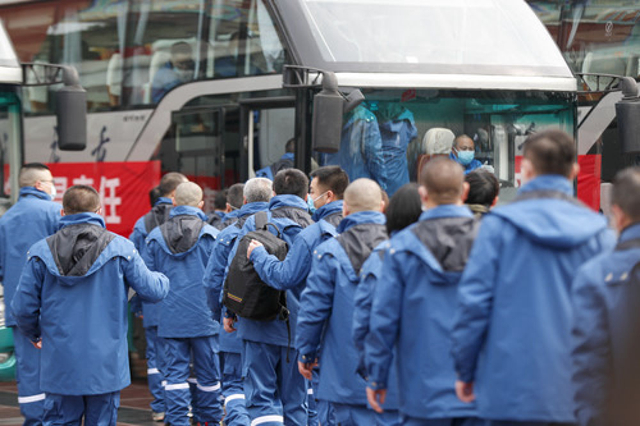 ↑2月11日,重慶對口支援湖北孝感醫療隊隊員登車前往重慶江北國際機場。新華社發(黃偉 攝)