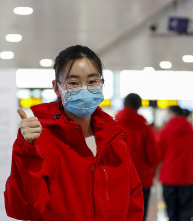 ↑2月20日,在重慶江北國際機場,重慶市第十三批支援湖北醫療隊隊員在出發前為自己加油。新華社發(黃偉 攝)