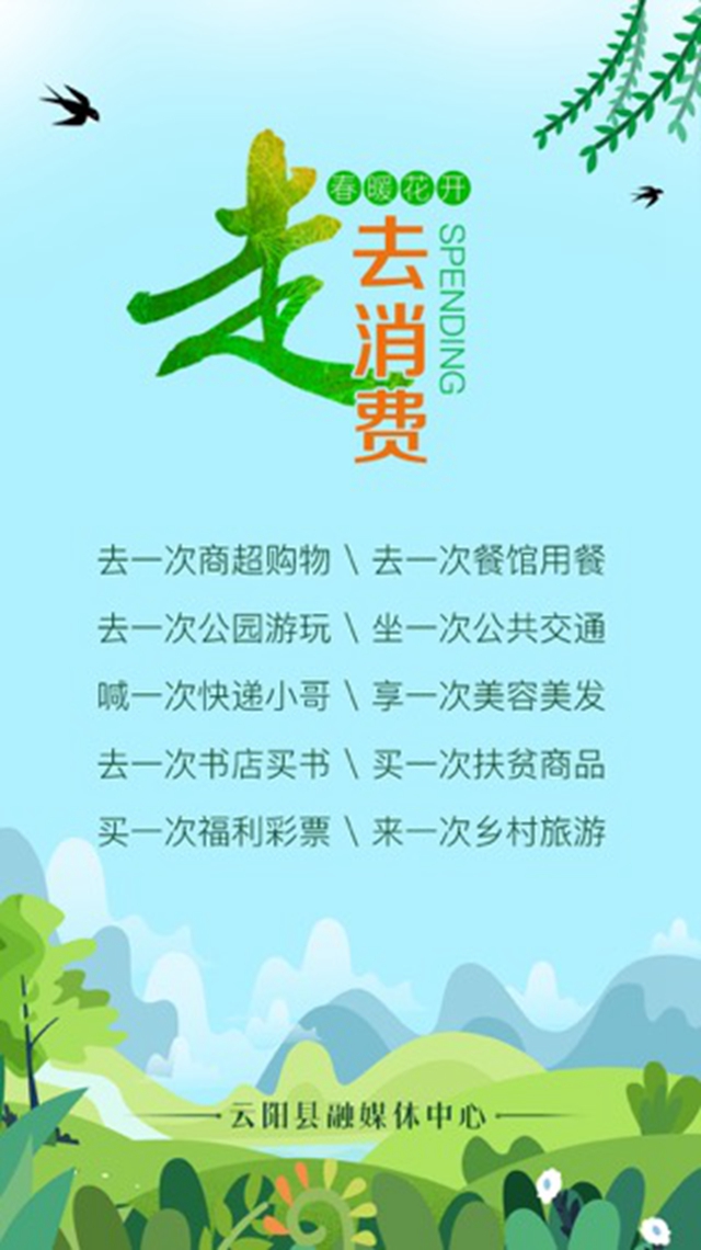 父老鄉(xiāng)親們!彩云陽光驅(qū)病魔,一疫過后百花開。疫情防控需要我們共同奮戰(zhàn),經(jīng)濟(jì)復(fù)蘇同樣需要我們共同努力。此刻,云陽的春天生機(jī)勃勃:月光草坪芳草萋萋、磐石城下梨花勝雪、棲霞萬畝油菜花吐露芬芳、云安千畝桃花綻放笑顏、龍缸景區(qū)數(shù)千株紅葉李唱著怒放的生命……讓我們走出來、去消費,去感受春光、去擁抱自然、去享受生活……讓我們走出來、去消費,去一次商超購物、去一次餐館用餐、去一次公園游玩、坐一次公共交通、喊一次快遞小哥、享一次美容美發(fā)、去一次書店買書、買一次扶貧商品、買一次福利彩票、來一次鄉(xiāng)村旅游……