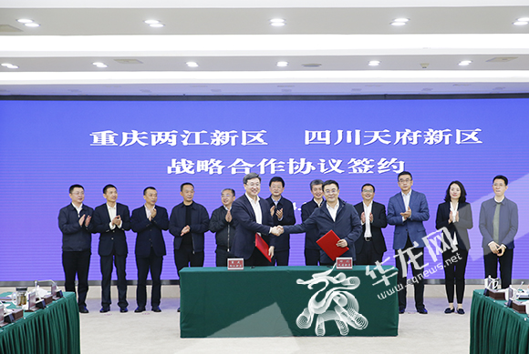 華龍網-新重慶客戶端4月23日16時40分訊(首席記者 佘振芳)今(23)日,重慶兩江新區與四川天府新區簽署戰略合作協議。根據協議內容,雙方將在攜手加強規劃戰略協同、探索內陸開放新模式、推進交通互聯互通、推進產業聯動發展、助力西部科學城建設、深化多領域改革創新合作、建立兩地合作機制等七個方面攜手深入合作。
