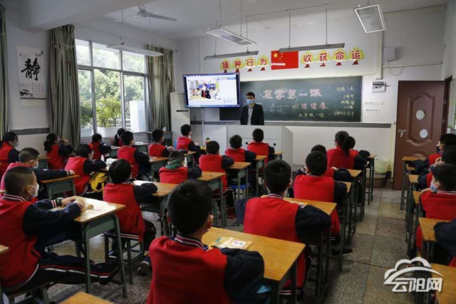 不上新課,不講試題。8點左右,該校組織各班圍繞“愛國主義教育、講述英雄人的抗疫故事、心理健康教育、觀看《開學第一課》視頻”為主題,進行了開學復課的第一課。