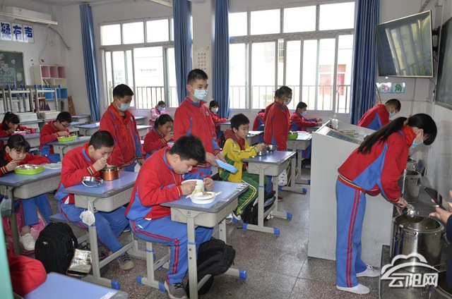 中午用餐是怎樣的呢?旁邊一位六年級的同學(xué)說:“我們用餐都是每個班上由四位班干部提到教室,其余同學(xué)分批次洗手,然后依次排隊分餐在自己的課桌上就餐。”