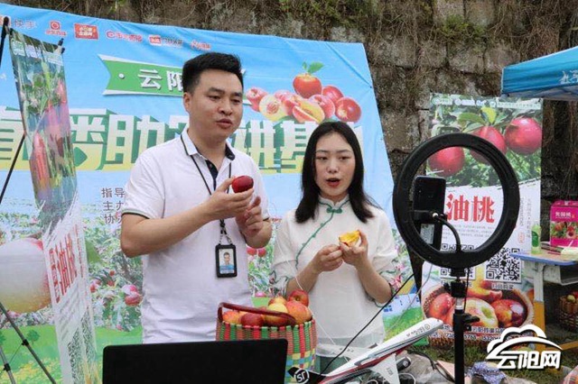 云陽網訊(記者 付驁 實習生 洪琳)5月27日,在渠馬鎮促進村桃園基地,滿園的桃樹枝繁葉茂、鮮果垂枝,讓人垂涎欲滴。一群身穿橙色背心的本土主播走進果園,現場品嘗油桃,為全國各地的網民朋友介紹油桃的生長情況、管護流程、成品果子的采摘細節等。