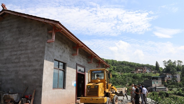 記者在李登成家院壩看到,一輛小型鏟車把混凝土運往院壩,卸下后,幫扶干部和黨員群眾開始平整地基、硬化地面,院壩硬化區(qū)變得平整光滑。