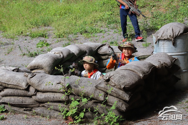 “埋伏!前方有敵軍出沒!”紅方小朋友趴伏在沙包巖體背后,雙手緊握“高端武器”,瞇著眼睛,趕緊對著“敵人”的頭盔、迷彩服上的“靶子”瞄準,扣動扳機……游戲結(jié)束,獲勝的小朋友李曉葒高興地說:“這次研學活動游戲中,我學會了團結(jié)協(xié)作,體會到了團結(jié)的力量。”