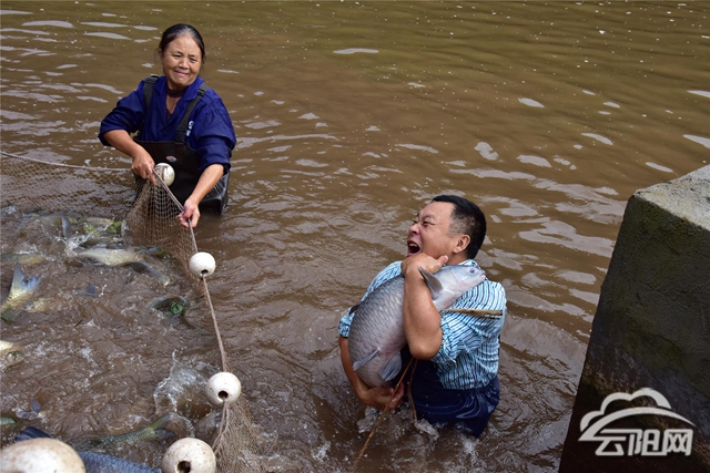 “這個大青魚有十多公斤喲,我抱都抱不住!”深秋時節(jié),在高陽鎮(zhèn)青樹村的水塘里,云陽縣漁公農業(yè)開發(fā)有限公司總經理溫定軍和村民正一起熱火朝天地網魚,網收緊后,肥美的大青魚、草魚、翹殼魚不停翻騰躍跳,引起水花四濺,溫定軍開心地抱起一條大青魚向記者展示。