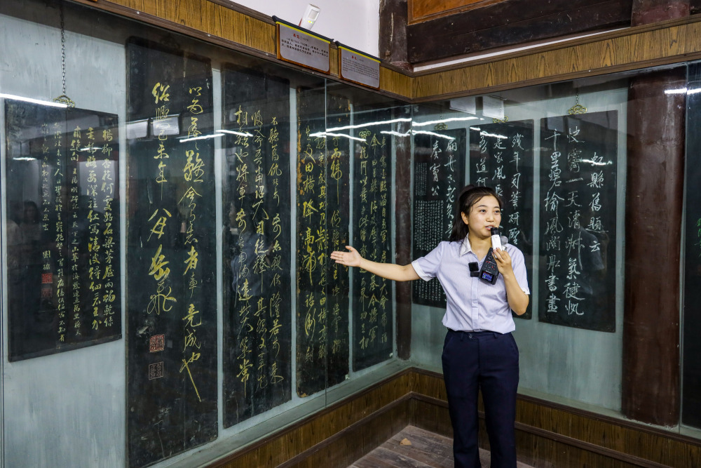 ▲9月11日,采訪團探訪張飛廟,導游正在介紹岳飛真跡碑刻。記者 尹詩語 攝/視覺重慶