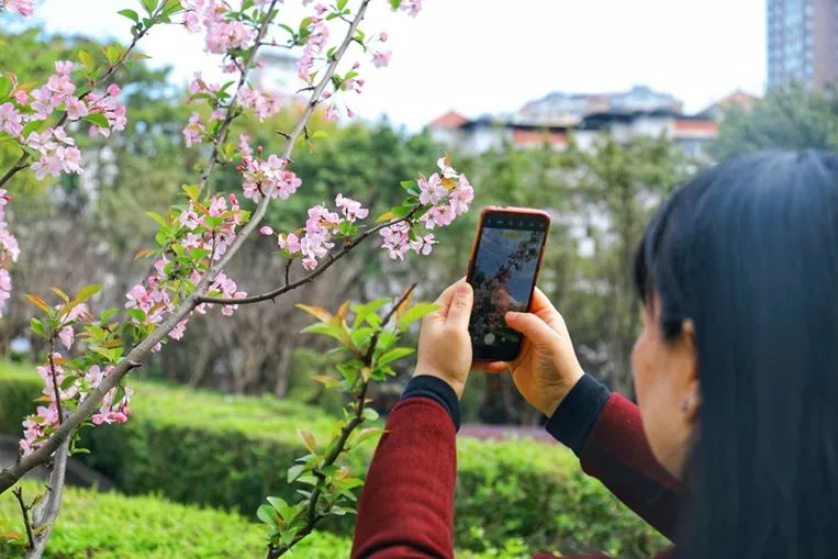 不少市民漫步花下,感受春天的美好