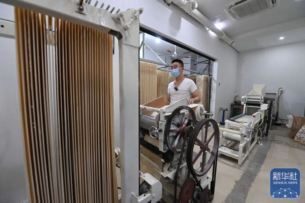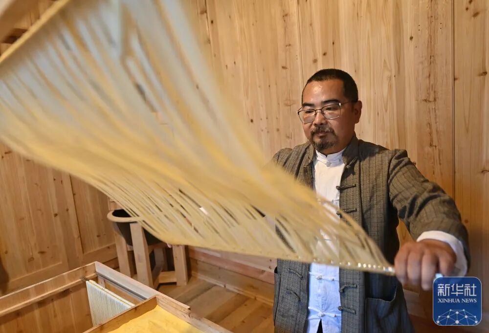 ↑ 11月4日,在巴陽杠子面生產工廠,巴陽杠子面傳統制作技藝傳承人劉益在展示制作技藝。巴陽杠子面是重慶市云陽縣的傳統面食之一,發源于巴陽峽兩岸,以竹杠壓面工藝和獨特口感著稱。